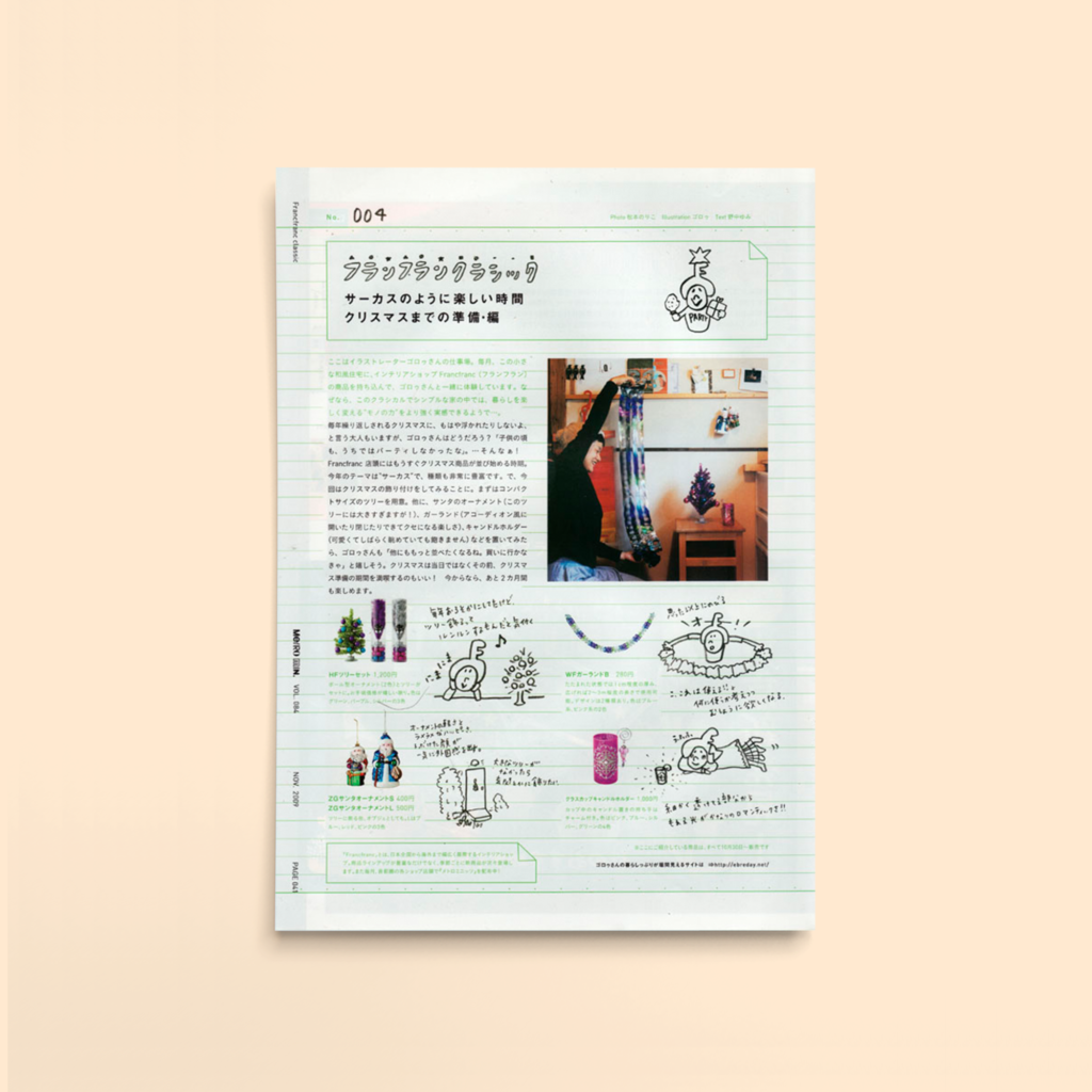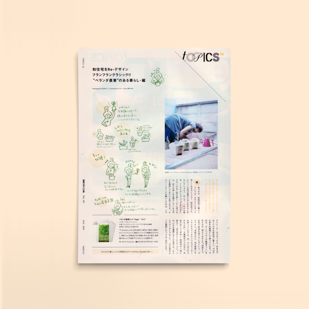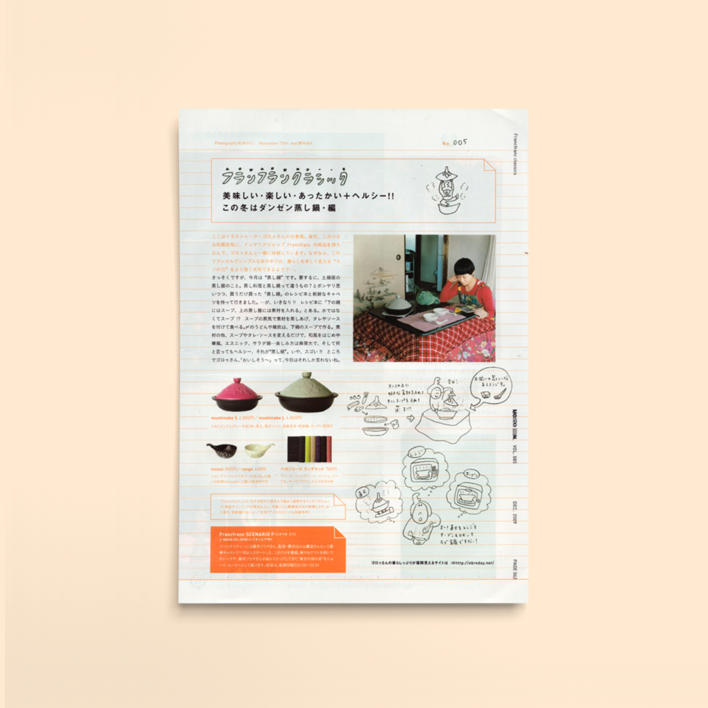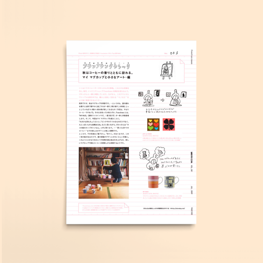 『メトロミニッツ』内 フランフランクラシックページイラスト 2009/04/07 デザイン イラスト 私の自宅で、フランフランの商品を使ったイメージ写真と共に私のイラストを載せてもらっていました。下井草に住んでいた頃です。デザインは別の方が担当してくださっています。